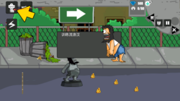 1、進(jìn)入戰(zhàn)斗,看到左上角黃色箭頭指向訓(xùn)練流浪漢的圖標(biāo),繼續(xù)點(diǎn)擊對(duì)應(yīng)的武器,可召喚或切換強(qiáng)力武器。