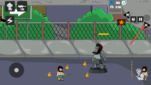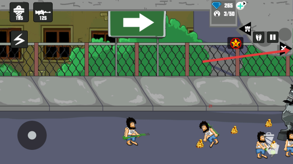 2、戰(zhàn)斗中遇到手持武器的流浪漢敵人,點(diǎn)擊右側(cè)搖桿操控角色靈活走位,躲避攻擊,同時(shí)用武器精準(zhǔn)射擊。
