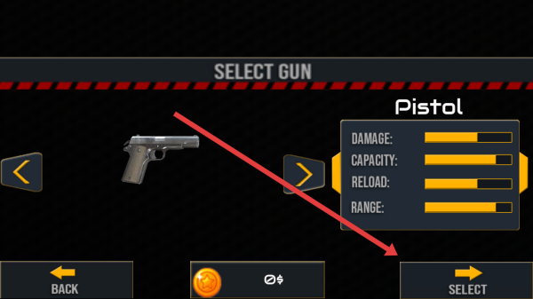 2、武器選擇界面中,選定Pistol手槍后,點(diǎn)擊右側(cè)SELECT按鈕,確認(rèn)所選武器,進(jìn)入關(guān)卡選擇界面,為射擊僵尸做準(zhǔn)備。