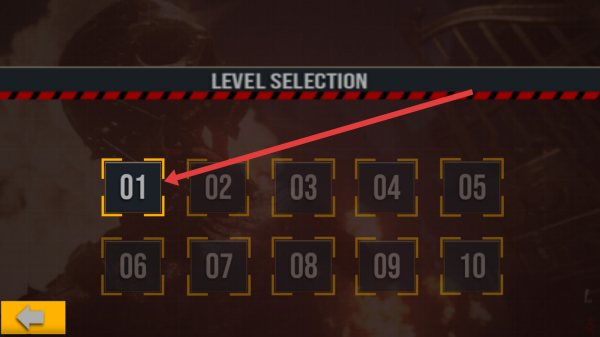 3、進(jìn)入關(guān)卡選擇界面,點(diǎn)擊標(biāo)有01的關(guān)卡按鈕,正式開啟第一場場僵尸射擊任務(wù),投身與僵尸的戰(zhàn)斗,推進(jìn)游戲進(jìn)程。
