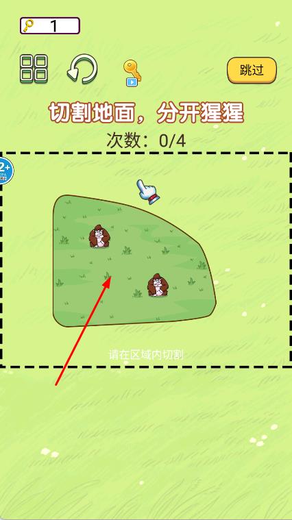 3、在操作過(guò)程中,注意切割的次數(shù)限制,合理規(guī)劃切割路線,盡量在規(guī)定次數(shù)內(nèi)將所有猩猩分開(kāi),當(dāng)成功將猩猩分開(kāi)后,完成關(guān)卡任務(wù)。