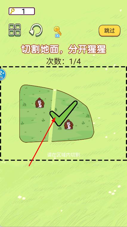 2、在場(chǎng)景中,根據(jù)提示切割地面,分開(kāi)猩猩 ,使用手指在屏幕上滑動(dòng),切割地面,將猩猩分隔開(kāi)。