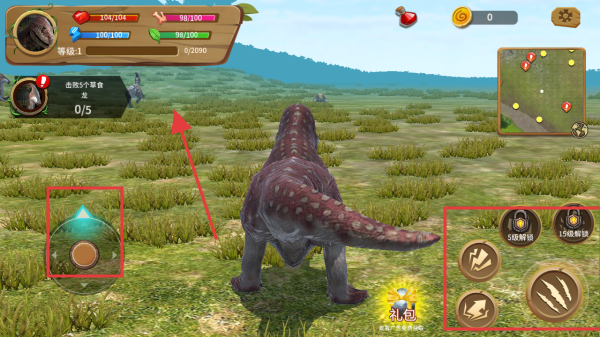 3、可通過左側(cè)搖桿控制恐龍移動(dòng),右側(cè)有多種技能按鈕,可根據(jù)情況使用技能,同時(shí)完成擊敗小型食草龍0/5等任務(wù)。