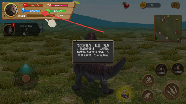 2、游戲中恐龍有生命、能量、饑餓等屬性,可通過捕食、休息等方式來增加這些屬性,當(dāng)能量為0時(shí)恐龍會死亡。