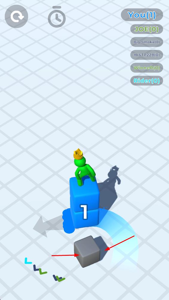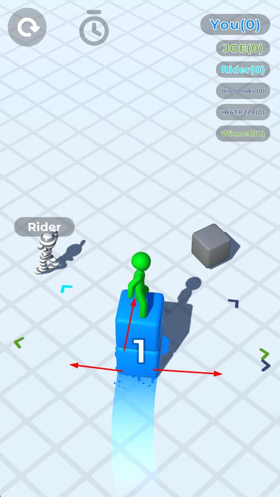 1、在網(wǎng)格場景中,通過屏幕方向箭頭控制綠色小人移動,選擇標(biāo)有數(shù)字的方塊作為初始占領(lǐng)點(diǎn),站穩(wěn)后得分開始累計(jì)。