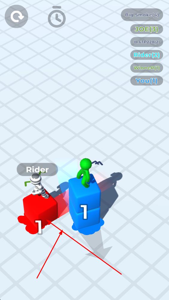 3、與其他玩家爭奪方塊資源,對手可能占領(lǐng)紅色方塊形成對抗,通過移動策略干擾對手占領(lǐng),奪取其方塊以增加自身得分。