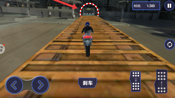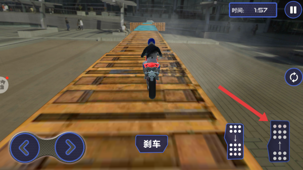 1、點(diǎn)擊右側(cè)帶向上箭頭的按鍵控制油門,啟動摩托車在木板的賽道起步前行,開啟競速挑戰(zhàn)。