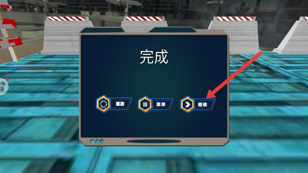 3、到達(dá)終點(diǎn)則關(guān)卡完成,需要點(diǎn)擊界面的繼續(xù)按鈕,可以順利的進(jìn)入下一關(guān)挑戰(zhàn),也可以選擇重新玩這一關(guān)。