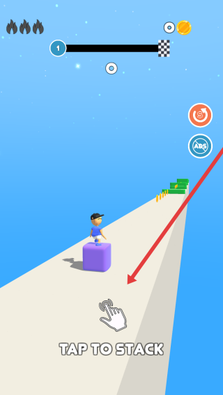 1、在游戲起始界面,依據(jù)TAP-TO-STACK提示點(diǎn)擊屏幕,使角色腳下堆疊方塊,為后續(xù)跨越道路障礙儲備前行基礎(chǔ)。