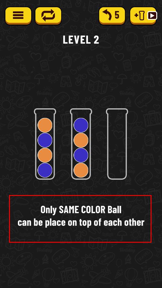 1、進入Level 2關(guān)卡,觀察試管內(nèi)橙、藍彩球分布,依據(jù)Only SAME COLOR Ball can be place on top of each other規(guī)則,點擊彩球準備移動。