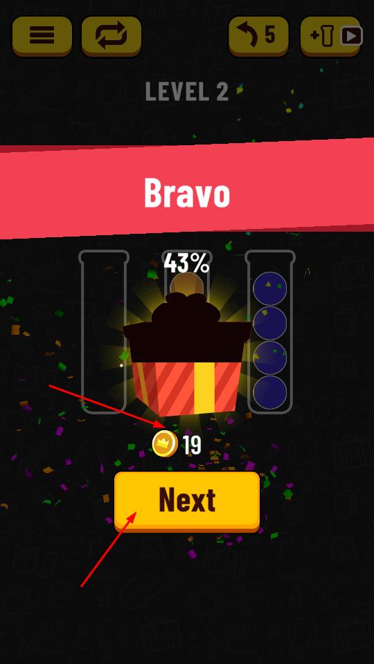 3、分類成功后,如果在界面顯示Bravo,獲得金幣獎勵如19,需要點擊黃色Next按鈕,推進至下一關(guān)挑戰(zhàn)。
