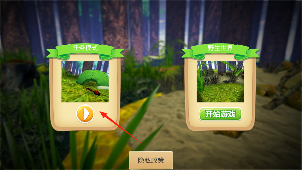 1、主界面有兩個(gè)模式可選,點(diǎn)左邊黃色按鈕進(jìn)任務(wù)模式會(huì)開(kāi)啟帶劇情的闖關(guān)玩法,右邊綠色按鈕是野生世界模式,能自由探索更原生態(tài)的草地環(huán)境,想先玩哪個(gè)隨你挑。