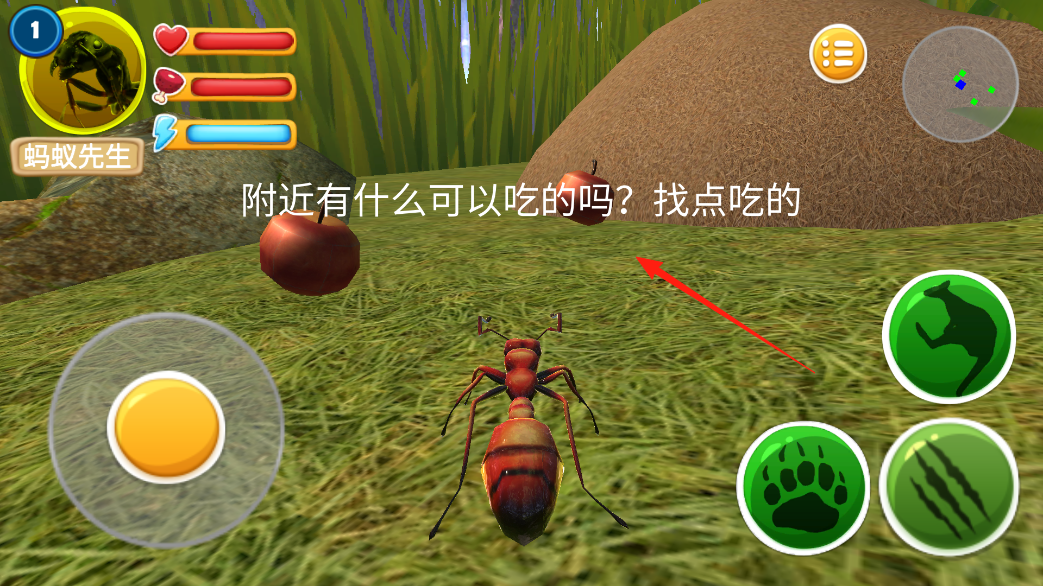 2、用左下角的搖桿控制螞蟻先生移動(dòng),在草地上找蘋(píng)果這類(lèi)食物來(lái)填飽肚子,注意看上方藍(lán)色耐力條,跑太久會(huì)消耗體力,找到食物就能恢復(fù)狀態(tài)繼續(xù)探索。