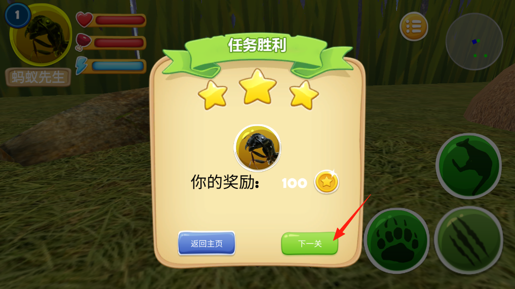 3、通關(guān)后會(huì)彈出獎(jiǎng)勵(lì)界面,拿到100金幣可以存著買(mǎi)道具或升級(jí)能力,想接著挑戰(zhàn)就點(diǎn)下一關(guān),暫時(shí)不玩的話按藍(lán)色按鈕返回主菜單就行。