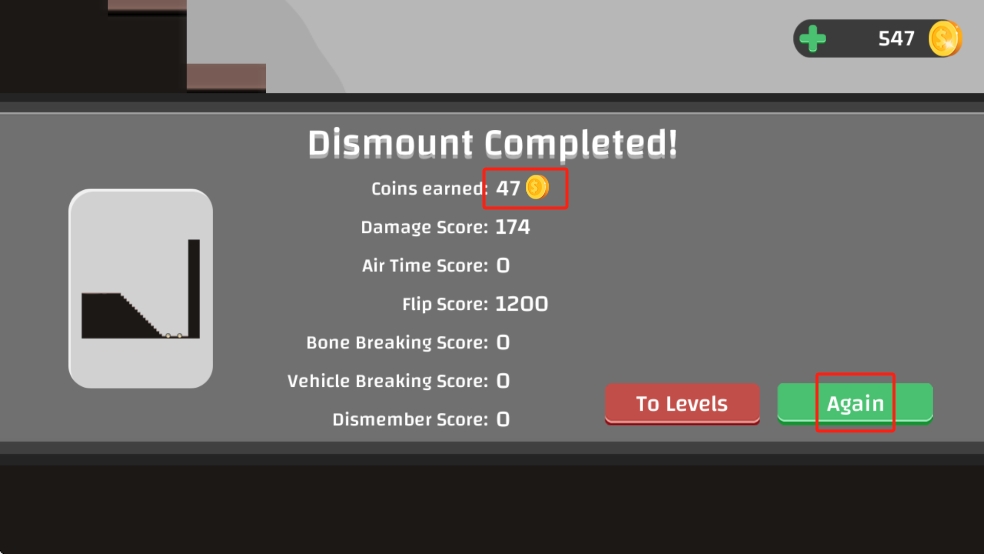 3、結(jié)算界面,若未達(dá)成1000分目標(biāo),點(diǎn)擊綠色的Again按鈕重玩,調(diào)整操作,讓火柴人在墜落中完成更多高分動(dòng)作。