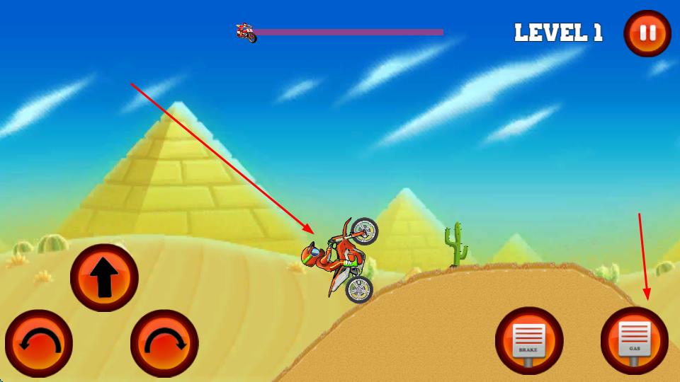 1、在主界面點擊右側(cè)黃色播放按鈕,進入Level 1關(guān)卡,操控紅色摩托騎手,在沙漠地形含金字塔、仙人掌場景開啟越野挑戰(zhàn)。