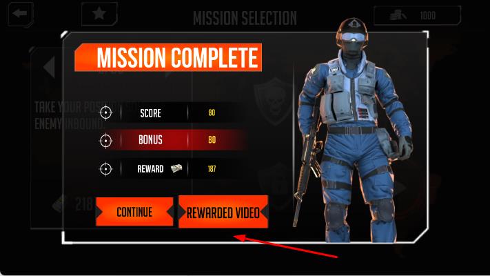 3、當(dāng)成功消滅所有目標(biāo)敵人后,完成任務(wù),顯示任務(wù)完成提示,可以選擇CONTINUE進(jìn)入下一個任務(wù)。