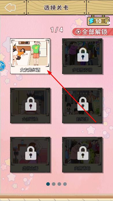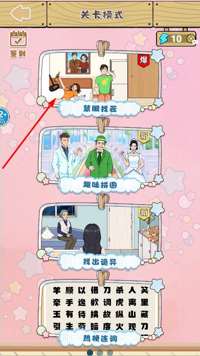 1、進(jìn)入游戲,在關(guān)卡模式界面選擇慧眼找茬,在關(guān)卡選擇界面,選擇可進(jìn)入的關(guān)卡。