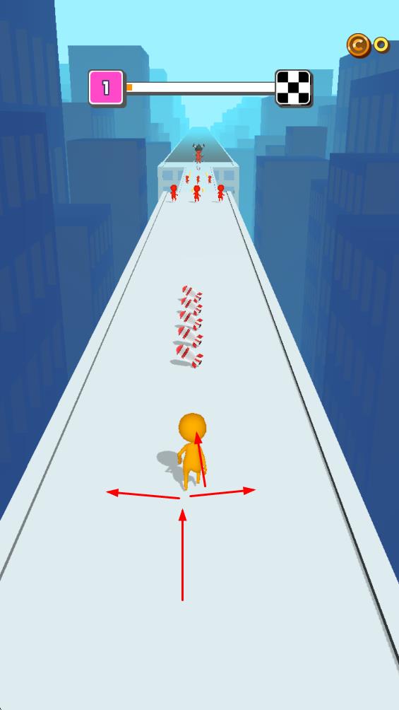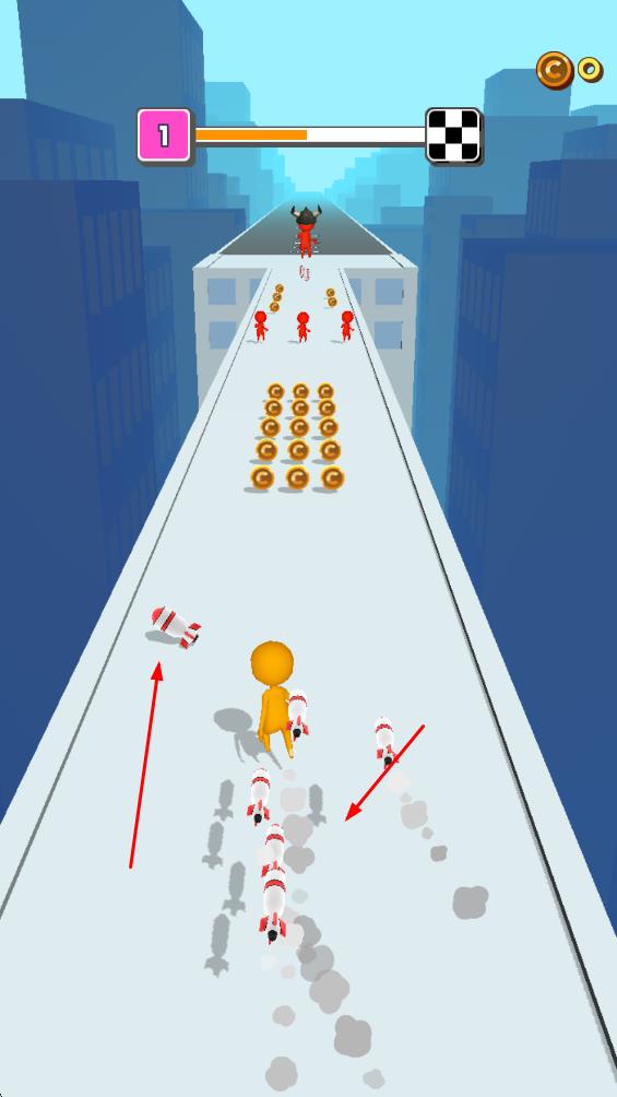 2、在跑道上遇到紅色小人敵人時(shí),利用收集到的火箭道具,點(diǎn)擊發(fā)射火箭將其擊敗,同時(shí)持續(xù)收集金幣,為挑戰(zhàn)更強(qiáng)敵人奠定基礎(chǔ)。