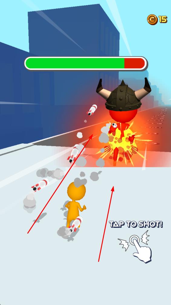 3、面對(duì)大型BOSS時(shí),依據(jù)TAPTOSHOT!提示,點(diǎn)擊屏幕發(fā)射火箭精準(zhǔn)攻擊,擊敗BOSS推進(jìn)關(guān)卡,同時(shí)關(guān)注進(jìn)度條,朝著通關(guān)目標(biāo)努力。