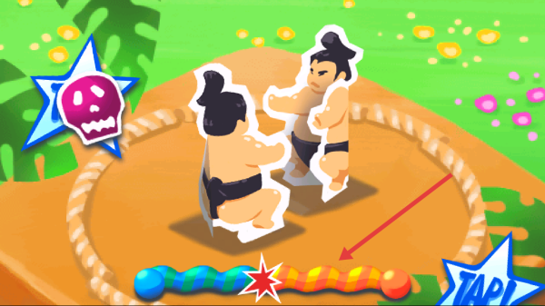 2、對(duì)戰(zhàn)時(shí)快速點(diǎn)擊下方彩條區(qū)域,積攢力量,推動(dòng)對(duì)手,嘗試將其擠出相撲圈,贏得勝利。