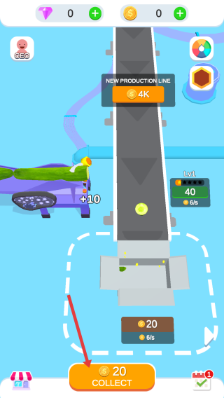 2、當(dāng)界面底部出現(xiàn)標(biāo)有20COLLECT的橙色按鈕時,點擊該按鈕,就能收集到相應(yīng)數(shù)量的金幣,積累游戲內(nèi)的資源。