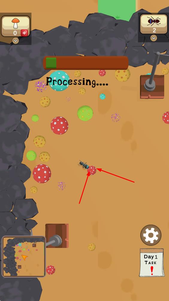2、在場景中引導(dǎo)螞蟻收集彩色蘑菇,收集過程中會顯示Processing...,完成資源處理,為后續(xù)任務(wù)積累素材。