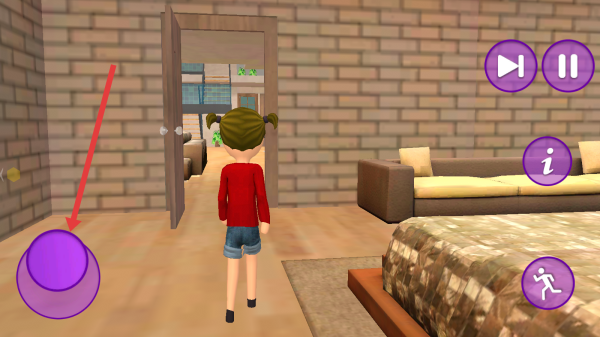 3、在游戲場(chǎng)景中,操作左側(cè)紫色虛擬搖桿,控制紅衣女孩在房間內(nèi)移動(dòng),探索環(huán)境以推進(jìn)關(guān)卡任務(wù)。
