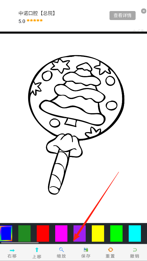 3、用底部色塊給圣誕棒棒糖上色,縮放功能可以調(diào)整細(xì)節(jié)部位,畫(huà)錯(cuò)時(shí)點(diǎn)撤銷(xiāo)按鈕,保存作品前還能用重置功能整體重來(lái),查看詳情能看到其他用戶(hù)的配色靈感。