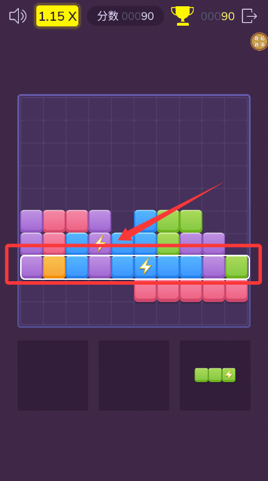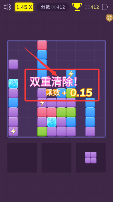 3、當某行或列被方塊完全填滿時,將觸發(fā)消除效果并獲得基礎積分。