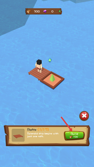 3、根據(jù)游戲提示,點擊BUILD按鈕,消耗相應的資源,開始搭建木筏,逐步擴大木筏的規(guī)模,提升在游戲中的生存能力和移動能力。