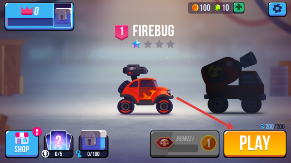1、進(jìn)入游戲主界面,選FIREBUG橙色戰(zhàn)車,點(diǎn)擊PLAY,匹配SKULL-O-BIKE摩托對(duì)手,開啟賽道對(duì)戰(zhàn)。