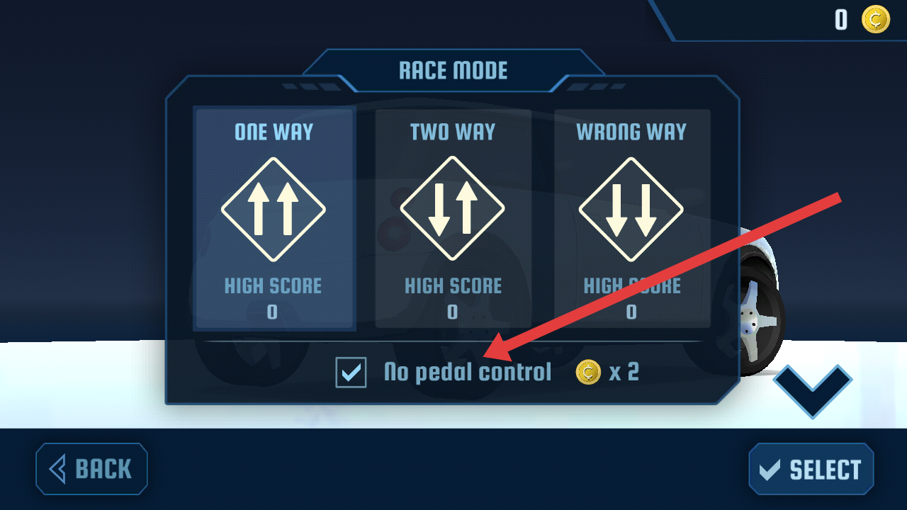 1、在模式選擇界面,勾選No pedal control可以獲金幣×2,選擇任意的賽道模式,開啟賽車挑戰(zhàn)。