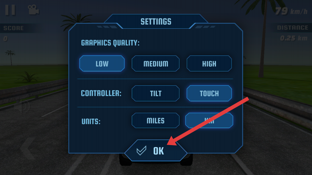 2、進(jìn)入設(shè)置界面,調(diào)整GRAPHICS QUALITY、CONTROLLER、UNITS后,點(diǎn)擊OK保存參數(shù),適配設(shè)備體驗(yàn)。