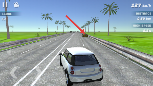 3、游戲中操控車輛,看見前方黃色的車,目前的速度是127km/h,在接近的同時(shí)調(diào)整自己的方向,做到安全超車。