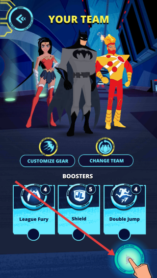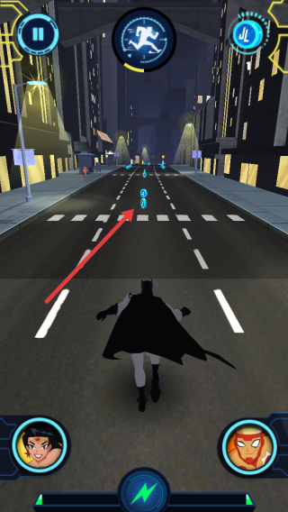 1、在隊(duì)伍界面,確認(rèn)蝙蝠俠等角色,點(diǎn)擊右下角啟動(dòng)按鈕,進(jìn)入城市跑酷場(chǎng)景,操控蝙蝠俠沿道路前進(jìn)。