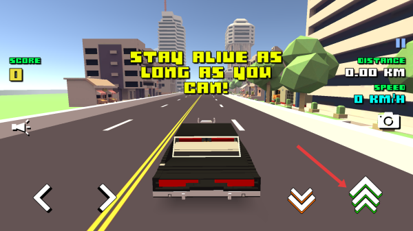 2、在駕駛過(guò)程中,利用屏幕上的方向控制按鈕,操控車(chē)輛在道路上行駛,同時(shí)注意躲避障礙物,盡可能長(zhǎng)時(shí)間生存。