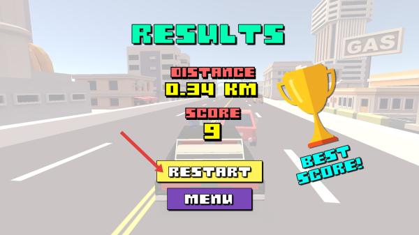 3、若游戲失敗,界面會(huì)顯示行駛距離和得分等結(jié)果,此時(shí)可點(diǎn)擊RESTART按鈕重新開(kāi)始游戲。