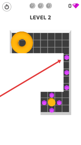 3、LEVEL2中,規(guī)劃小球移動路線,先收集右側(cè)紫色寶石,借助甜甜圈位置,配合操作讓小球順利完成收集,推進關(guān)卡進程。