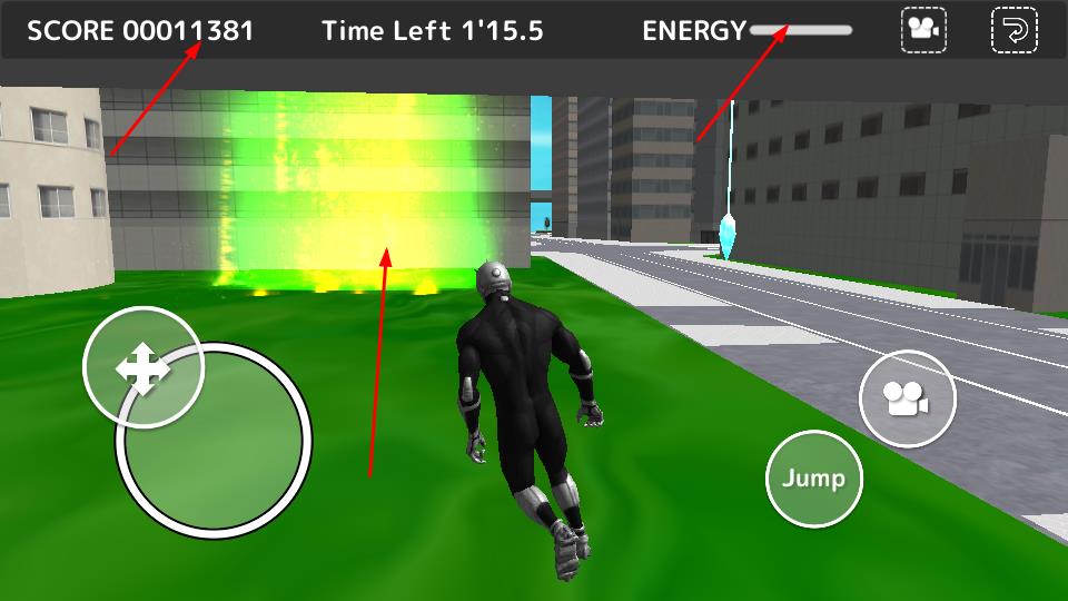 1、操控黑色機(jī)甲角色,通過左側(cè)虛擬搖桿控制移動(dòng)方向,點(diǎn)擊右側(cè)Jump按鈕完成跳躍,留意頂部分?jǐn)?shù)、剩余時(shí)間及能量條變化,向綠色傳送門等目標(biāo)推進(jìn)。