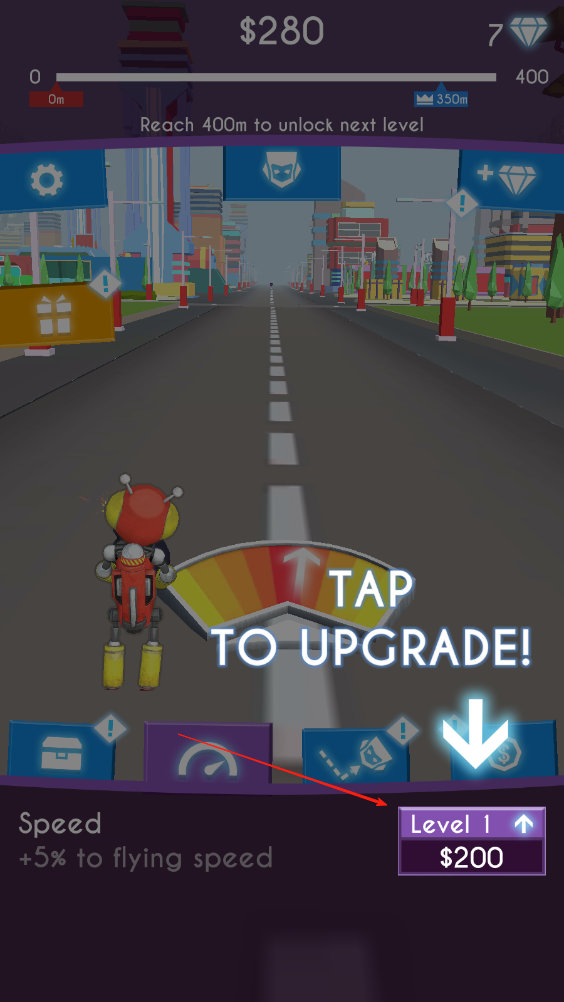 2、當(dāng)人物快掉落在地的時(shí)候點(diǎn)擊釋放炸彈,將自己炸起來(lái)繼續(xù)向前飛行,注意觀察上方進(jìn)度條,達(dá)到400米才能進(jìn)入下一關(guān)。