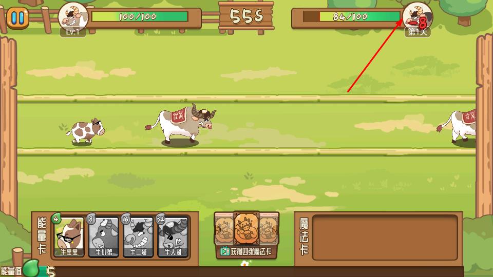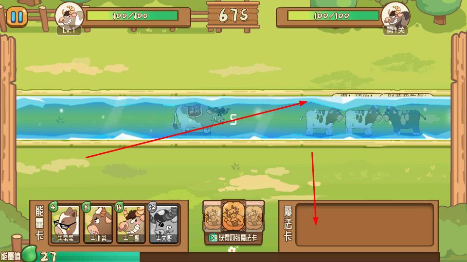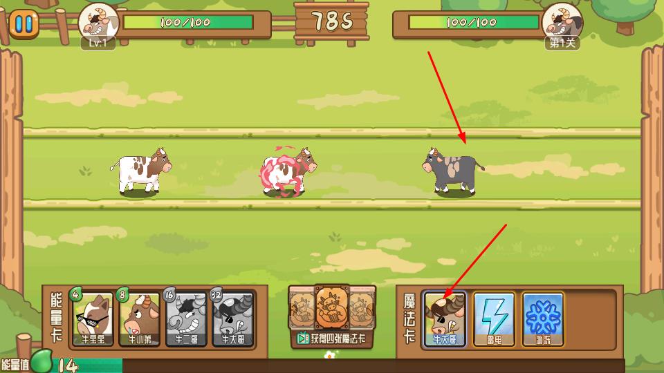 2、然后對戰(zhàn)時點擊魔法卡如冰凍釋放效果,凍結敵方牛群,阻礙其行動,借助己方牛群攻擊,消耗敵方血量。