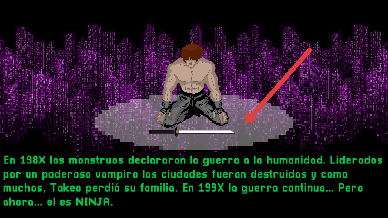 2、進(jìn)入游戲后,需要了解198X怪物戰(zhàn)爭(zhēng)背景,拾取Takeo面前的刀,開啟NINJA的復(fù)仇冒險(xiǎn)。