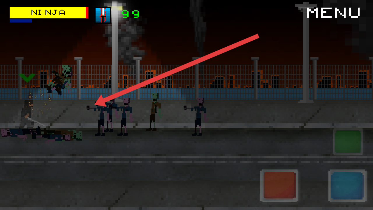 3、進(jìn)入戰(zhàn)斗實(shí)操,操控NINJA運(yùn)用跳躍、攻擊,對(duì)抗街頭僵尸,主角擁有四種攻擊形態(tài)選擇適合自己的形態(tài)。