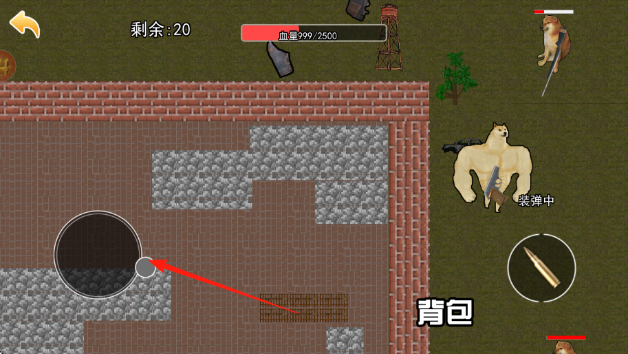 3、用左側(cè)搖桿移動,躲避敵人攻擊,利用地形磚墻、掩體,推進至剩余20敵人階段,持續(xù)輸出。