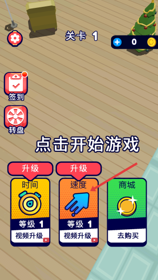 1、處于關(guān)卡1初始界面時(shí),先留意左側(cè)速度升級(jí)選項(xiàng),花費(fèi)資源點(diǎn)擊它提升移動(dòng)效率,優(yōu)化基礎(chǔ)能力后,再點(diǎn)擊顯眼的開始游戲按鈕,正式開啟對(duì)局。