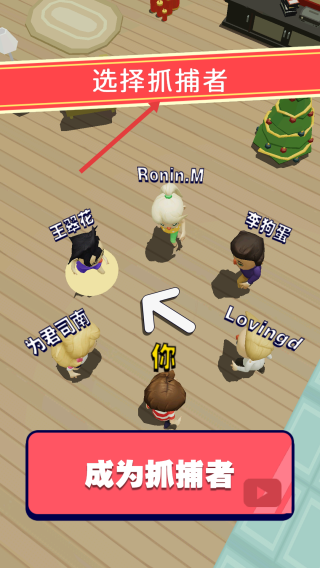 2、進(jìn)入選擇抓捕者界面,界面呈現(xiàn)多個(gè)可選角色,找到底部醒目的成為抓捕者按鈕并點(diǎn)擊,選定心儀角色,以此身份開啟趣味抓捕玩法,準(zhǔn)備追捕其他玩家。