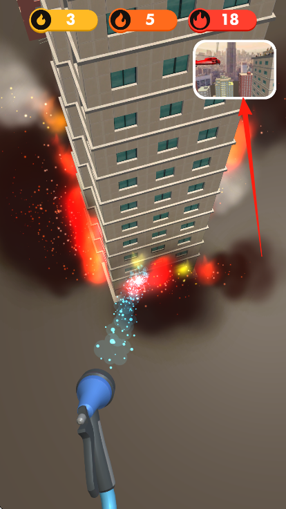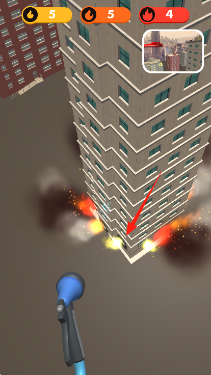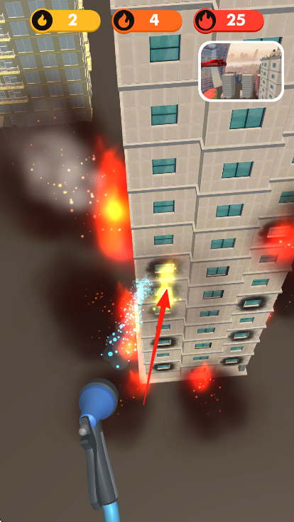 3、緊盯箭頭標(biāo)記的著火樓層,用水槍精準(zhǔn)滅火,控制危險值,配合地圖提示,完成滅火任務(wù)。