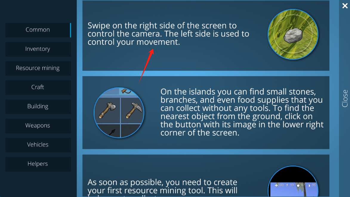 1、教程界面,牢記右劃控鏡頭、左劃移角色,島嶼可徒手撿石頭樹(shù)枝,點(diǎn)擊查看文檔。