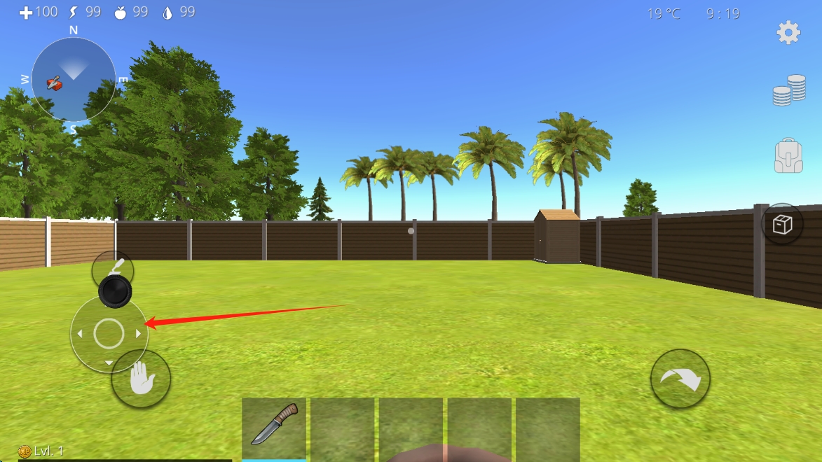 2、游戲場(chǎng)景,滑動(dòng)虛擬搖桿,探索初始區(qū)域,熟悉操作與環(huán)境,點(diǎn)擊撥動(dòng)輪盤(pán)移動(dòng)人物。